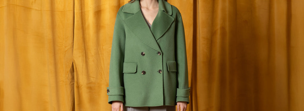 Inspired by a woman who gave voice to a new ecological awareness, a pioneer of environmentalism who, through her writings, stirred consciences and ignited the debate on safeguarding the planet.This short double-breasted caban, crafted from pure wool double cloth, blends elegance with functionality. The semi-over silhouette and handmade finishes highlight artisanal quality, while tailored details such as flap pockets and frogs reinterpret the classic caban in a contemporary way. A versatile, timeless garment that embodies the determination of those who strongly defended nature.