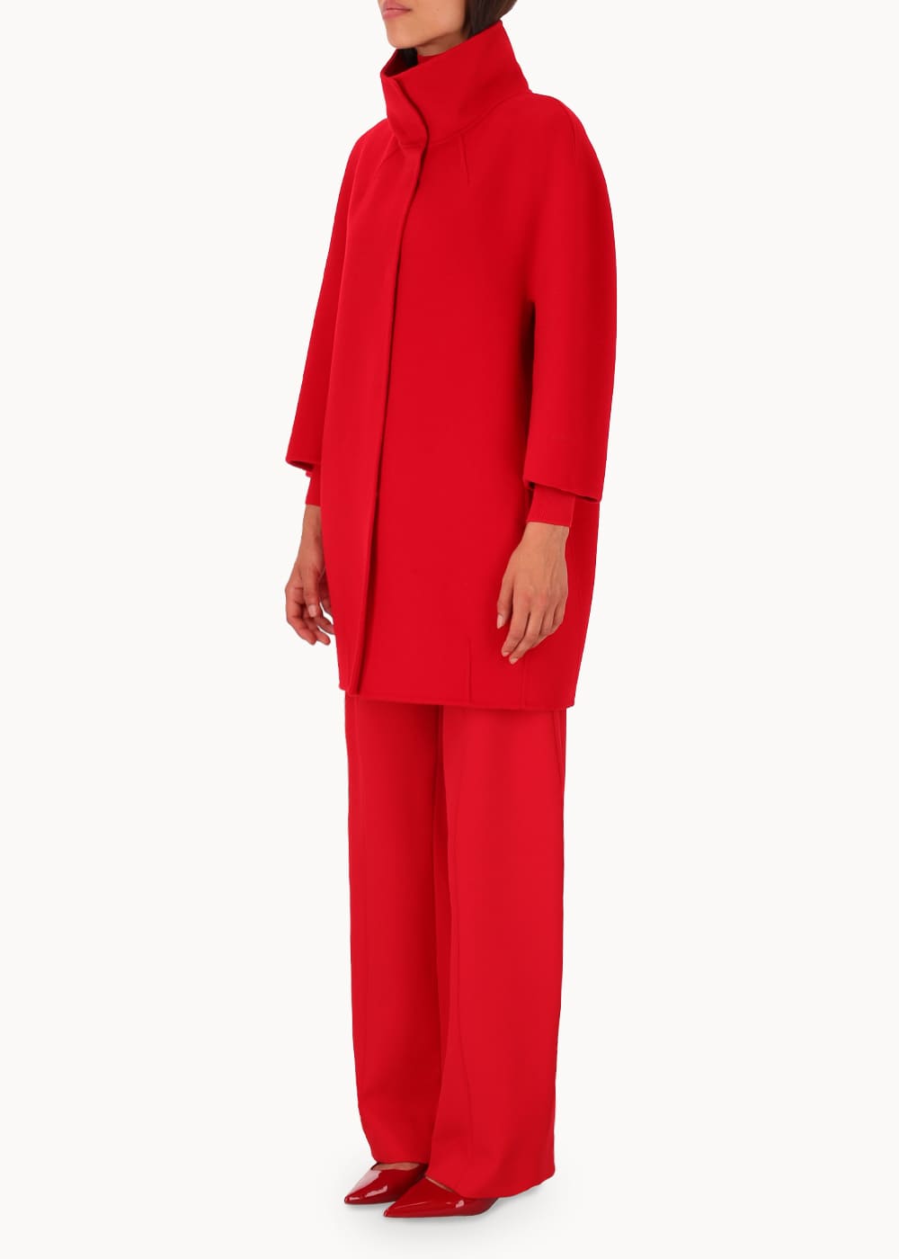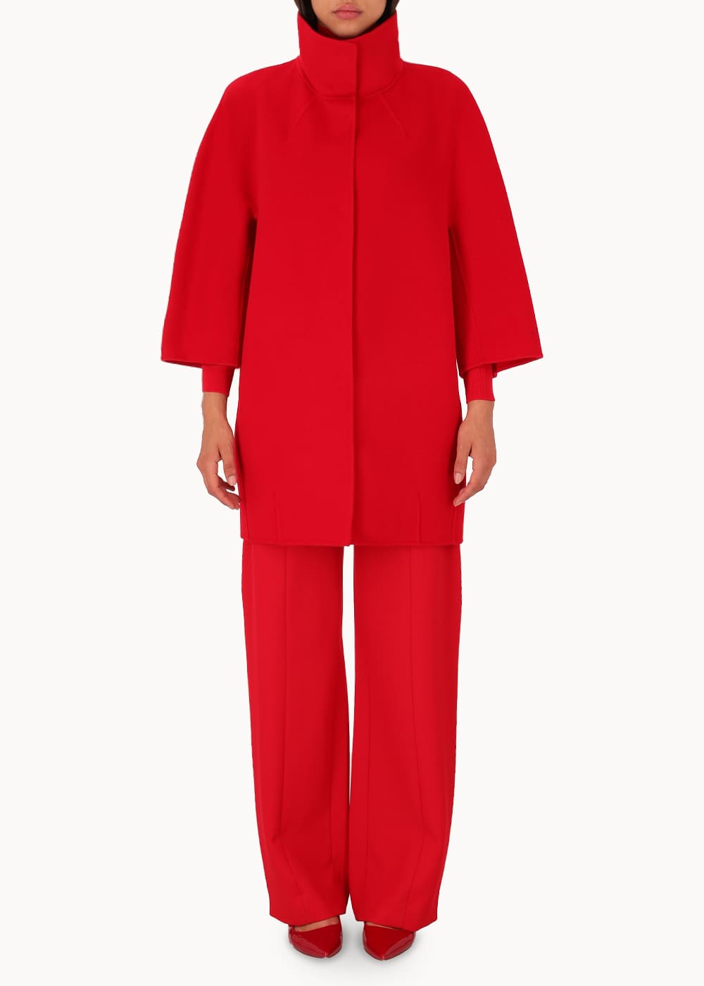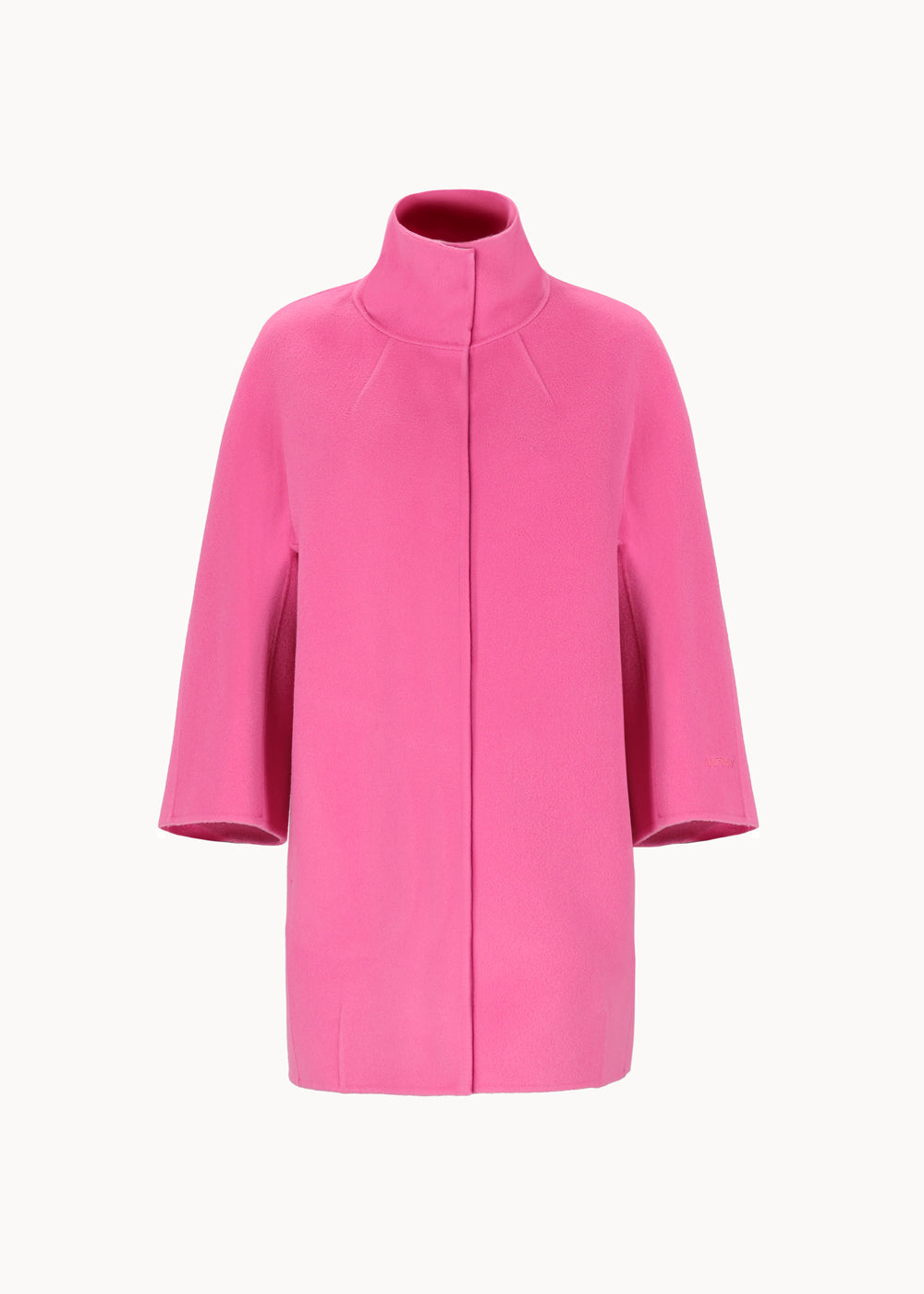 Short "egg" hood, made of double wool cloth. The model features an over silhouette with ¾ sleeves with embroidered logo on the bottom. Pockets inserted in the sides and a hidden closure with 6 resin snap buttons. Unlined coat.