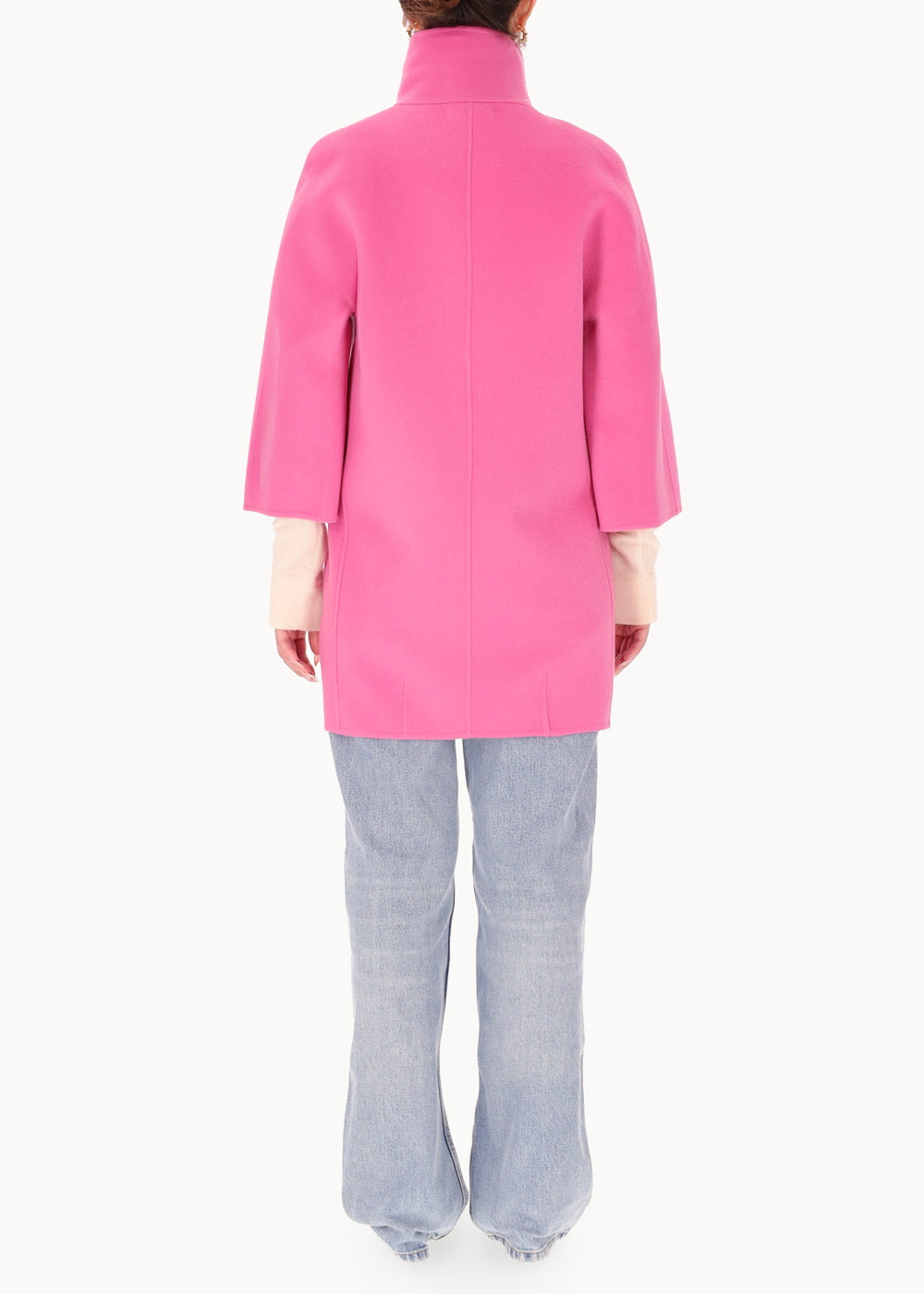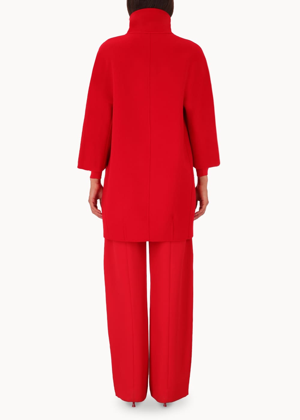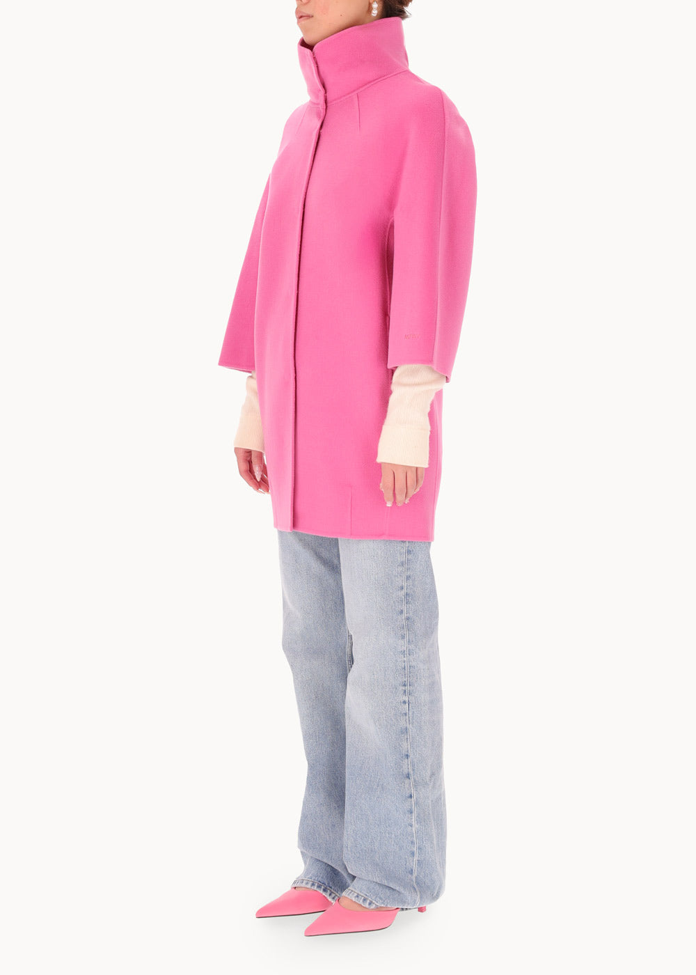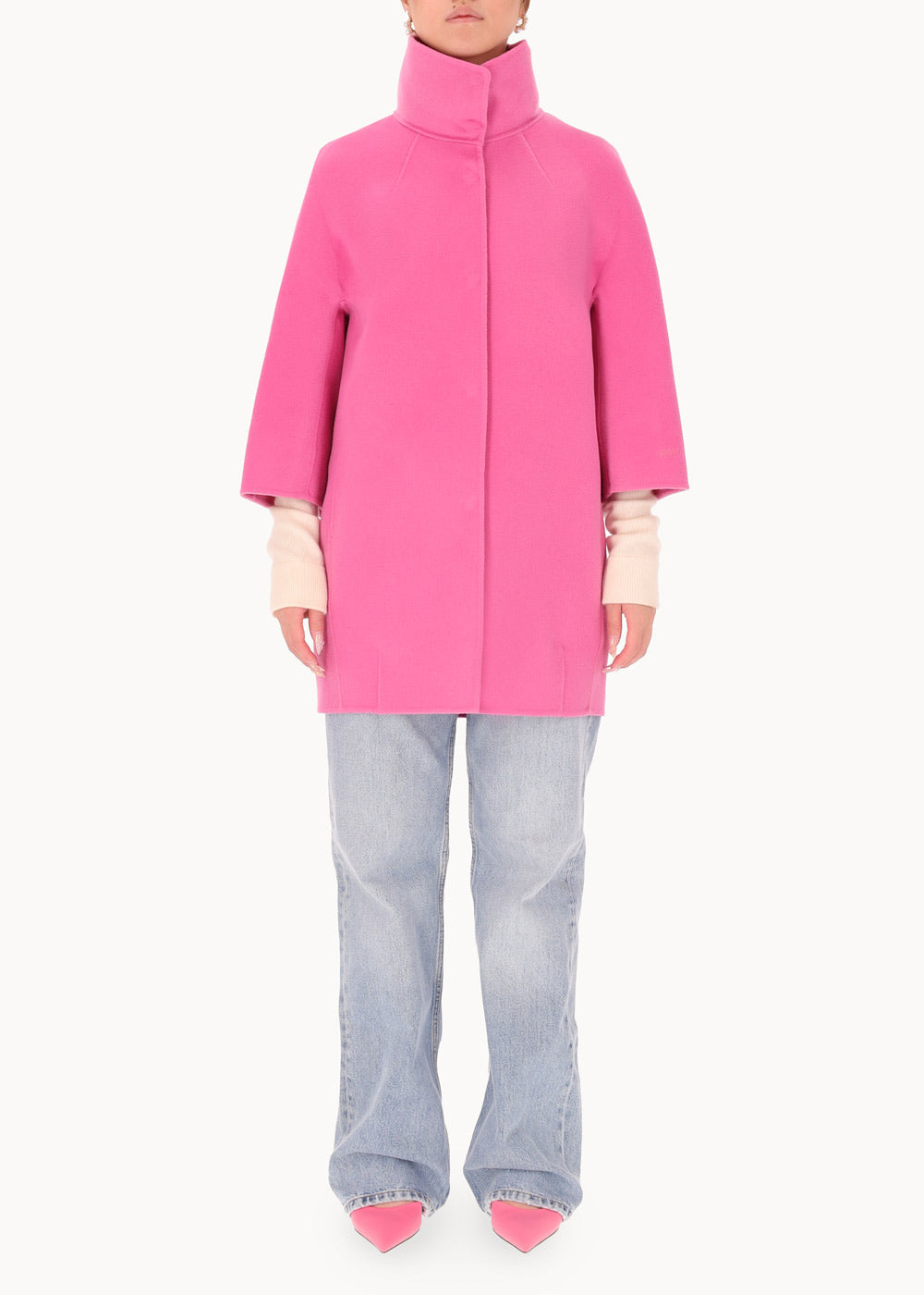 Short "egg" hood, made of double wool cloth. The model features an over silhouette with ¾ sleeves with embroidered logo on the bottom. Pockets inserted in the sides and a hidden closure with 6 resin snap buttons. Unlined coat.