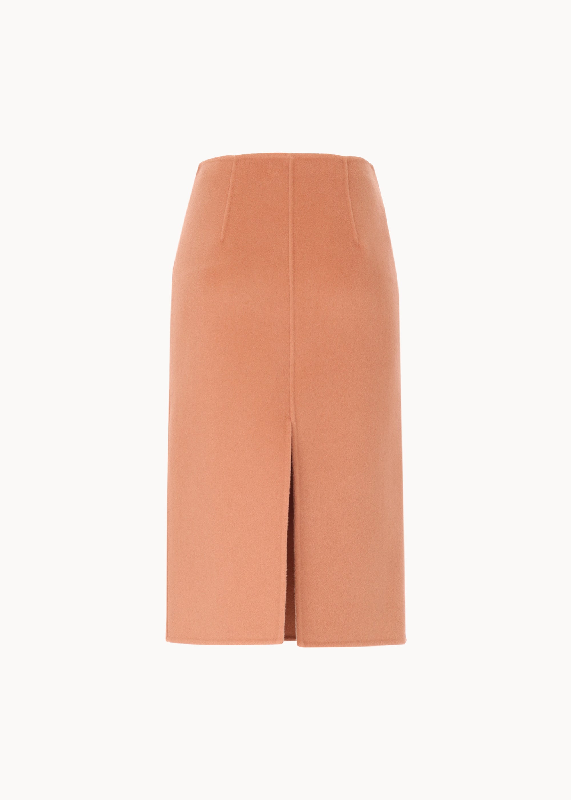 A tailored pencil skirt in double wool cloth, featuring a straight silhouette and a front slit for ease of movement. Unlined with classic double stitching, it combines elegance with refined craftsmanship.