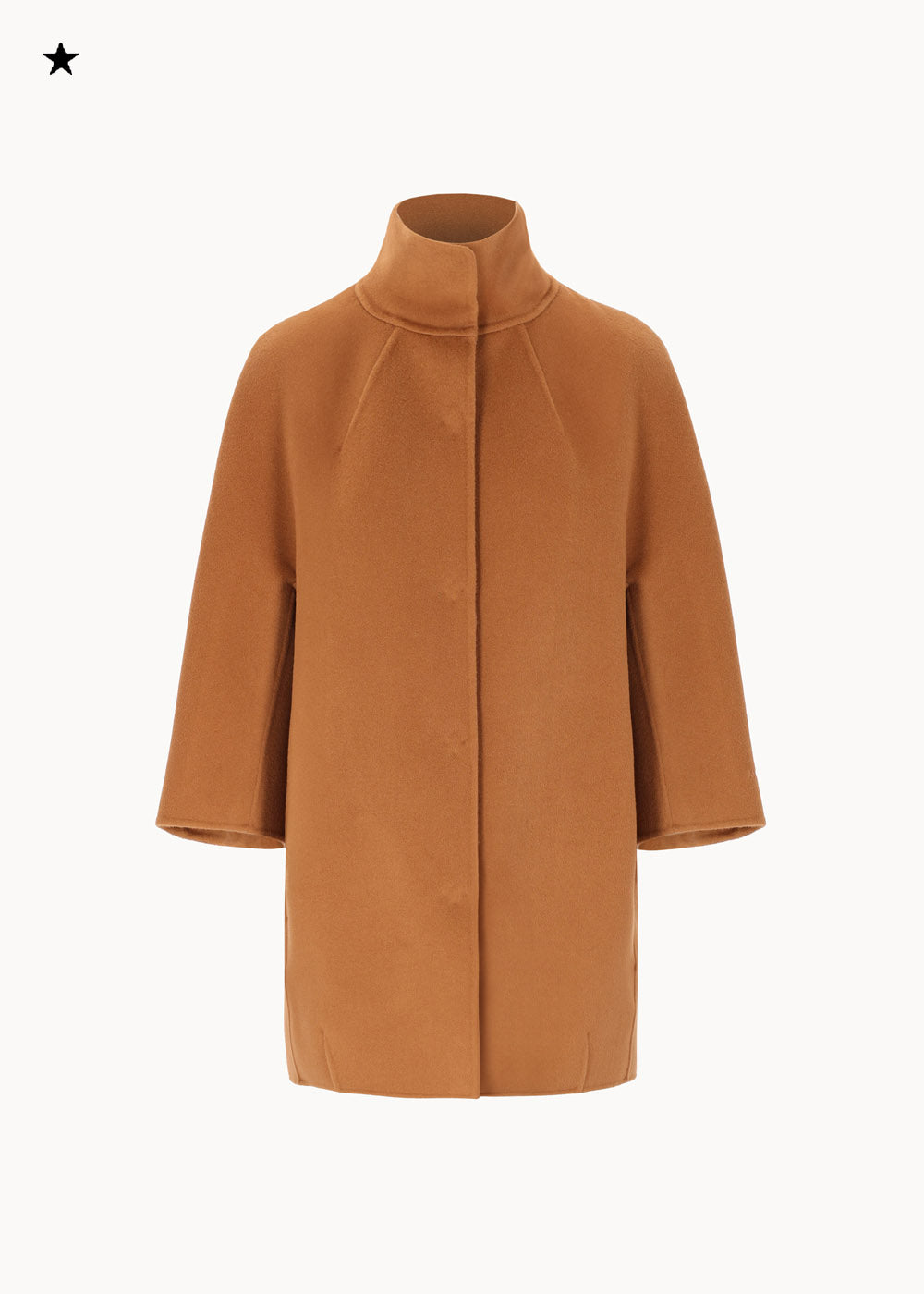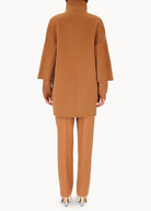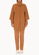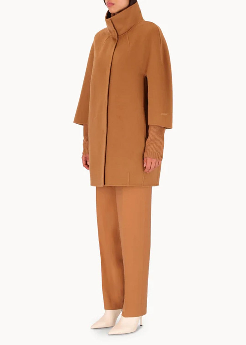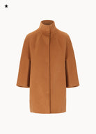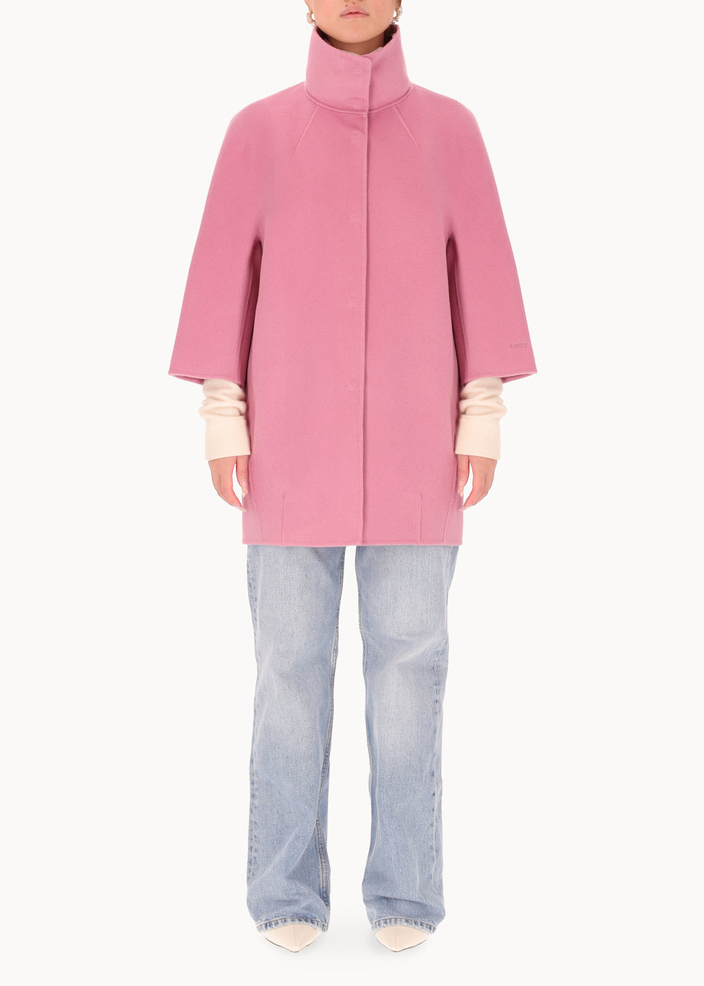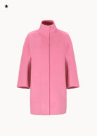 Short "egg" hood, made of double wool cloth. The model features an over silhouette with ¾ sleeves with embroidered logo on the bottom. Pockets inserted in the sides and a hidden closure with 6 resin snap buttons. Unlined coat.