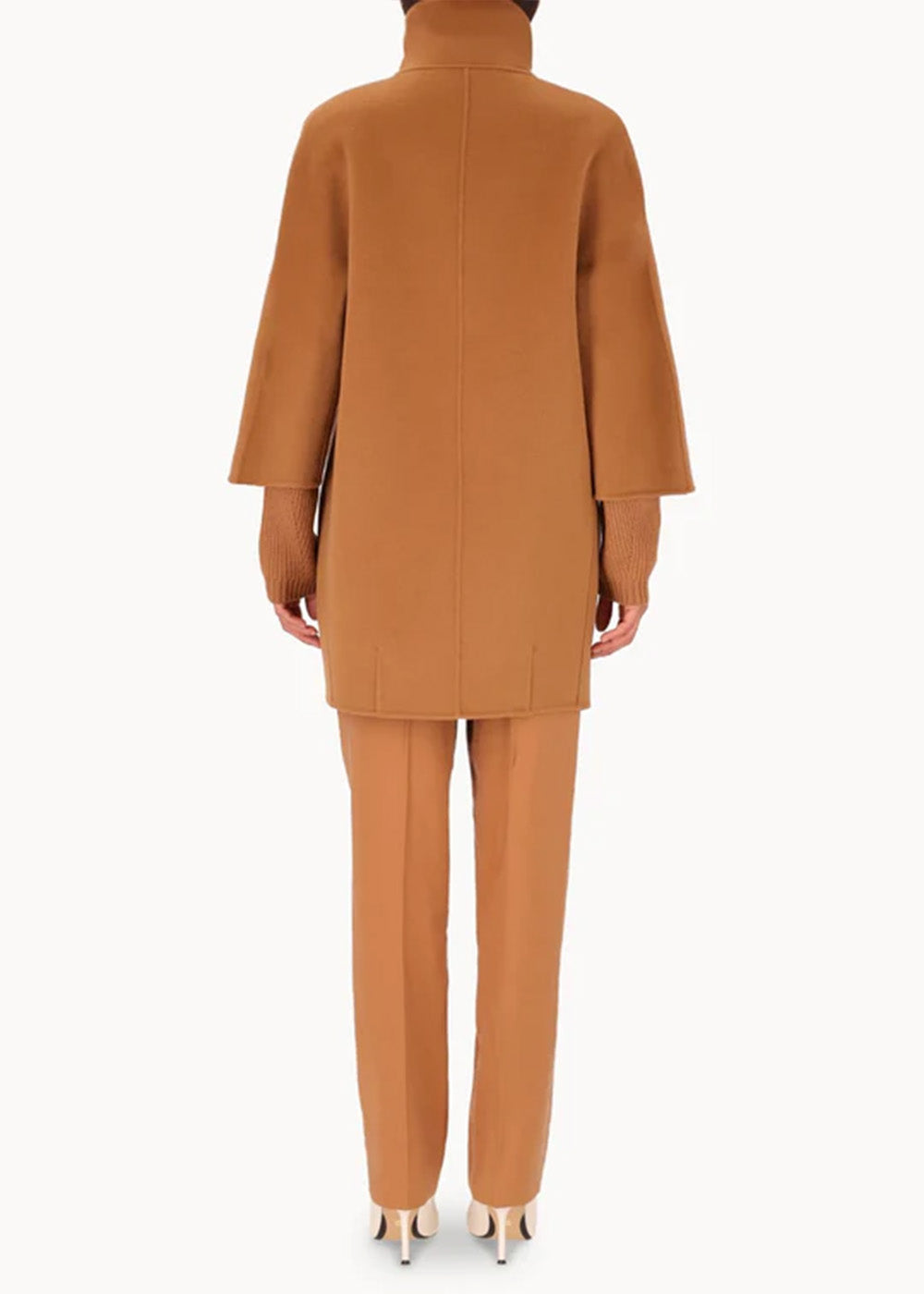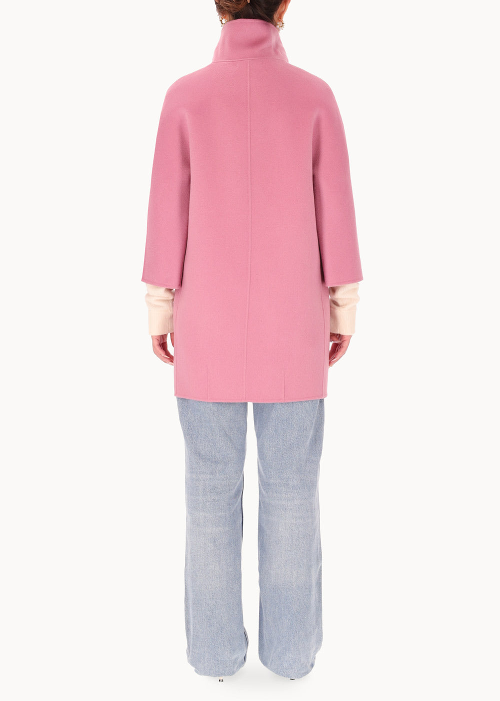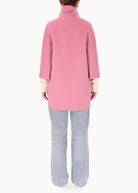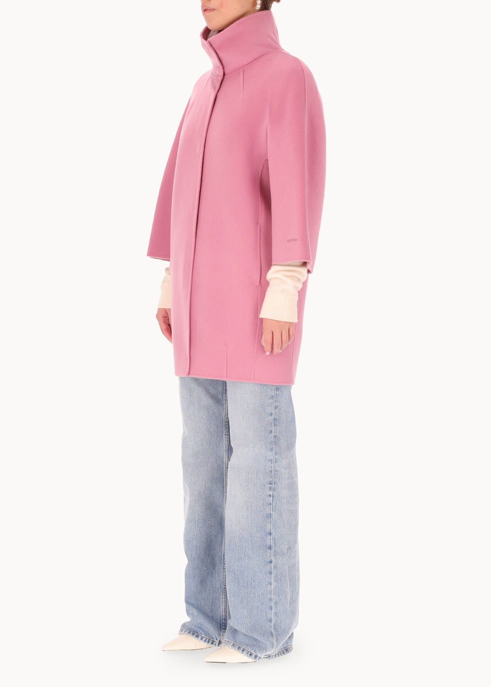 Short "egg" hood, made of double wool cloth. The model features an over silhouette with ¾ sleeves with embroidered logo on the bottom. Pockets inserted in the sides and a hidden closure with 6 resin snap buttons. Unlined coat.