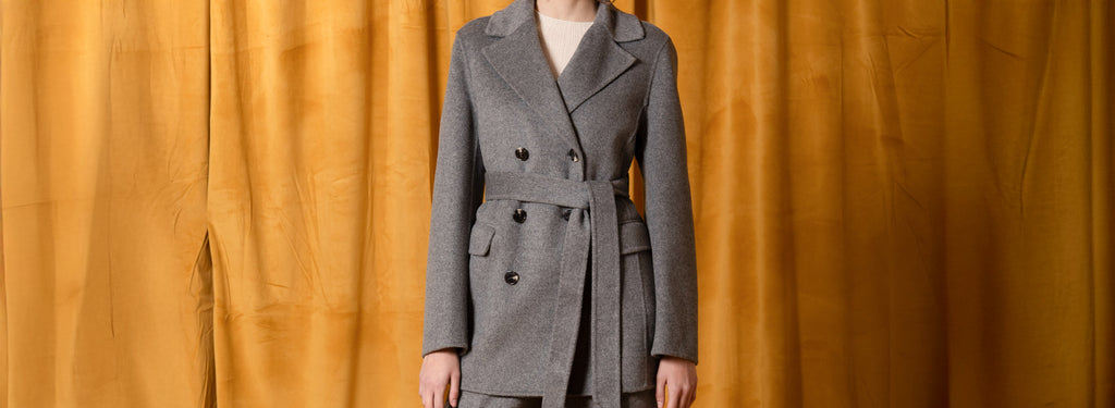 Inspired by a woman who fought for freedom and justice, advocating equality and peace with determination and intellectual rigor. Her ability to spread ideas and knowledge left a lasting mark on society.This double-breasted safari jacket in wool double cloth, with a semi-fitted straight line, blends elegance with functionality. The belt shapes the silhouette, while handmade finishes and tailored details reinterpret classic elements in a contemporary way. A versatile garment that celebrates the commitment and vision of those who helped change the world with courage and intelligence.