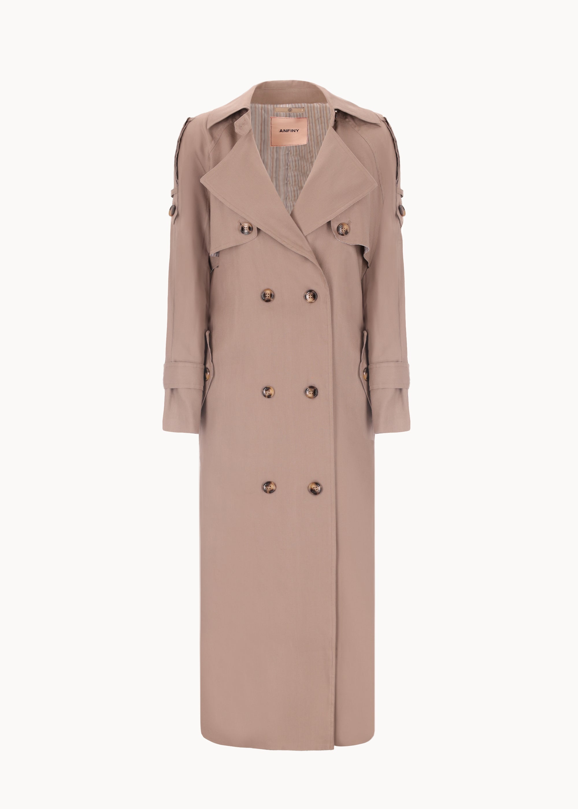 Double-breasted trench coat in linen with a straight, oversized silhouette and a length of 124 cm. Features a 6-button closure in 4-hole resin. Semi-lined with contrast striped lining for a refined finish. Designed with flap pockets, a back vent, and a rear belt that allows for two different front fastening options.