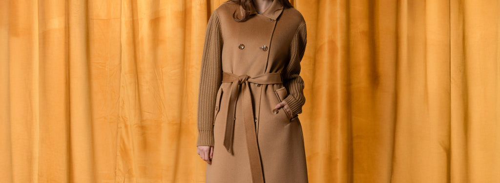 Inspired by a woman who turned her style into a language of freedom and creativity, an icon who left an indelible mark on fashion and design with her unique and unconventional approach.This double-breasted trench coat in wool double cloth blends elegance with character. The semi-fitted line is enhanced by a belt that shapes the silhouette, while the knitted sleeves add a contemporary and versatile touch. Handmade finishes and tailored details modernize the timeless appeal of the trench. A garment that celebrates the expressive power of those who made style an art.