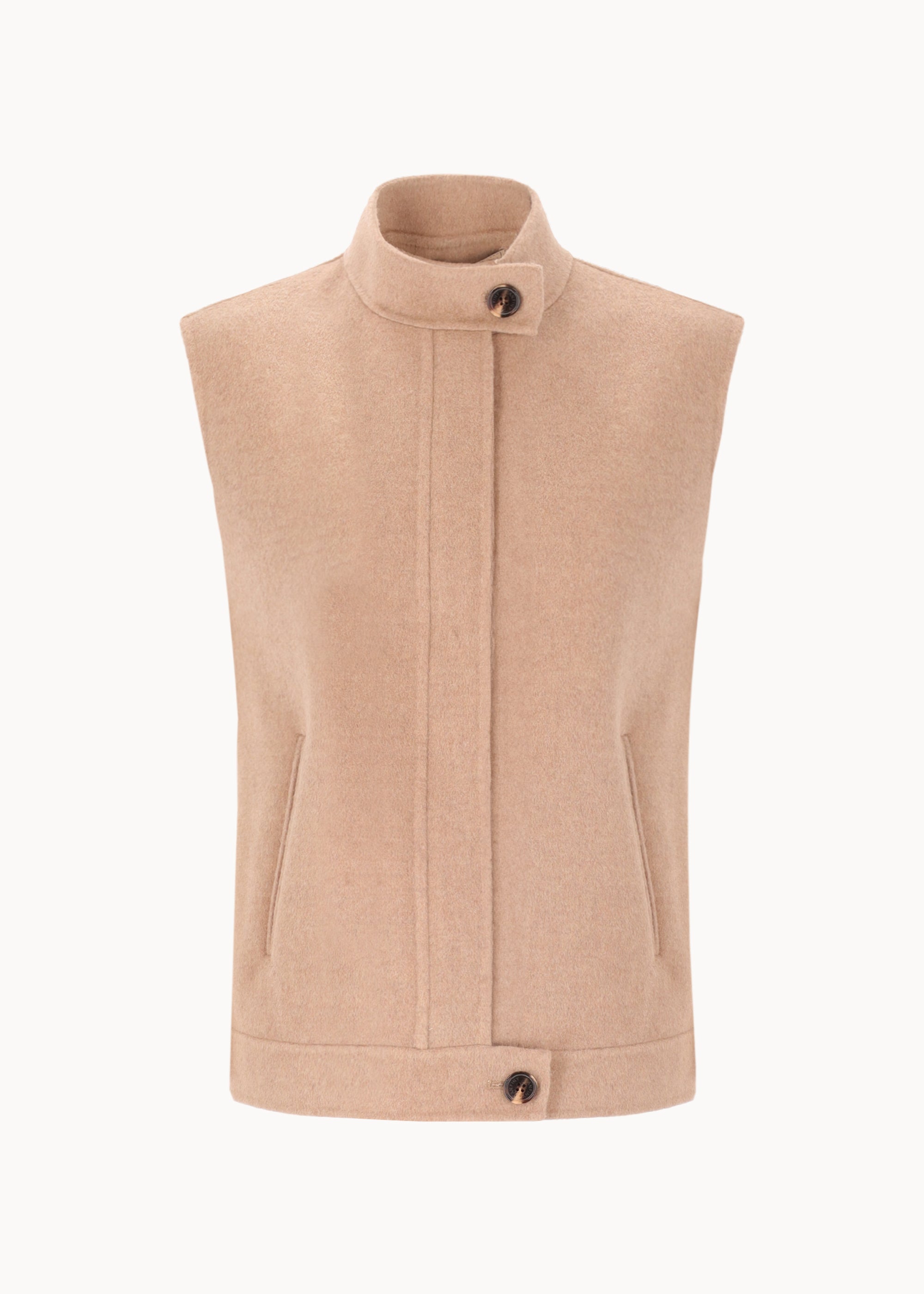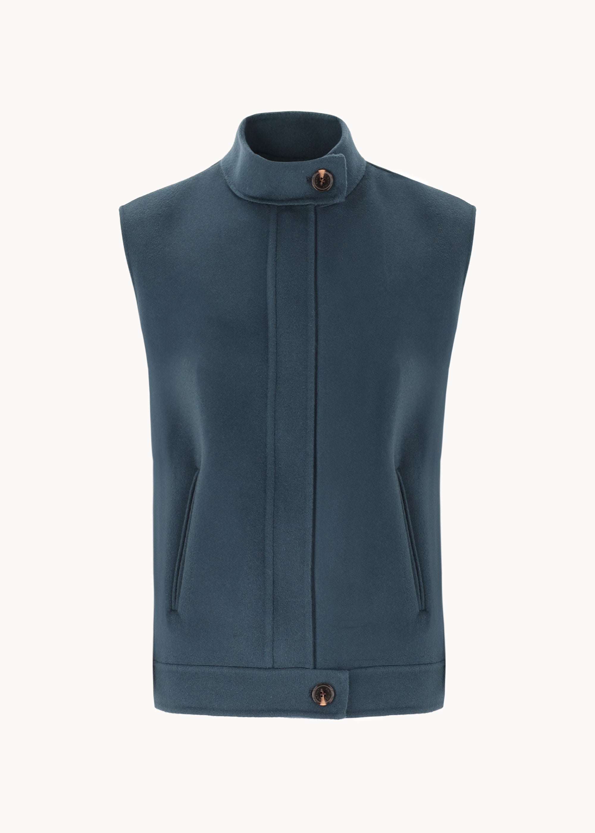 Gilet a bomber con collo coreana, realizzato in panno double di lana. Semifoderato con rifiniture tipiche del double, presenta tasche a doppio filetto e zip nascosta in metallo T5 per un look moderno ed elegante.