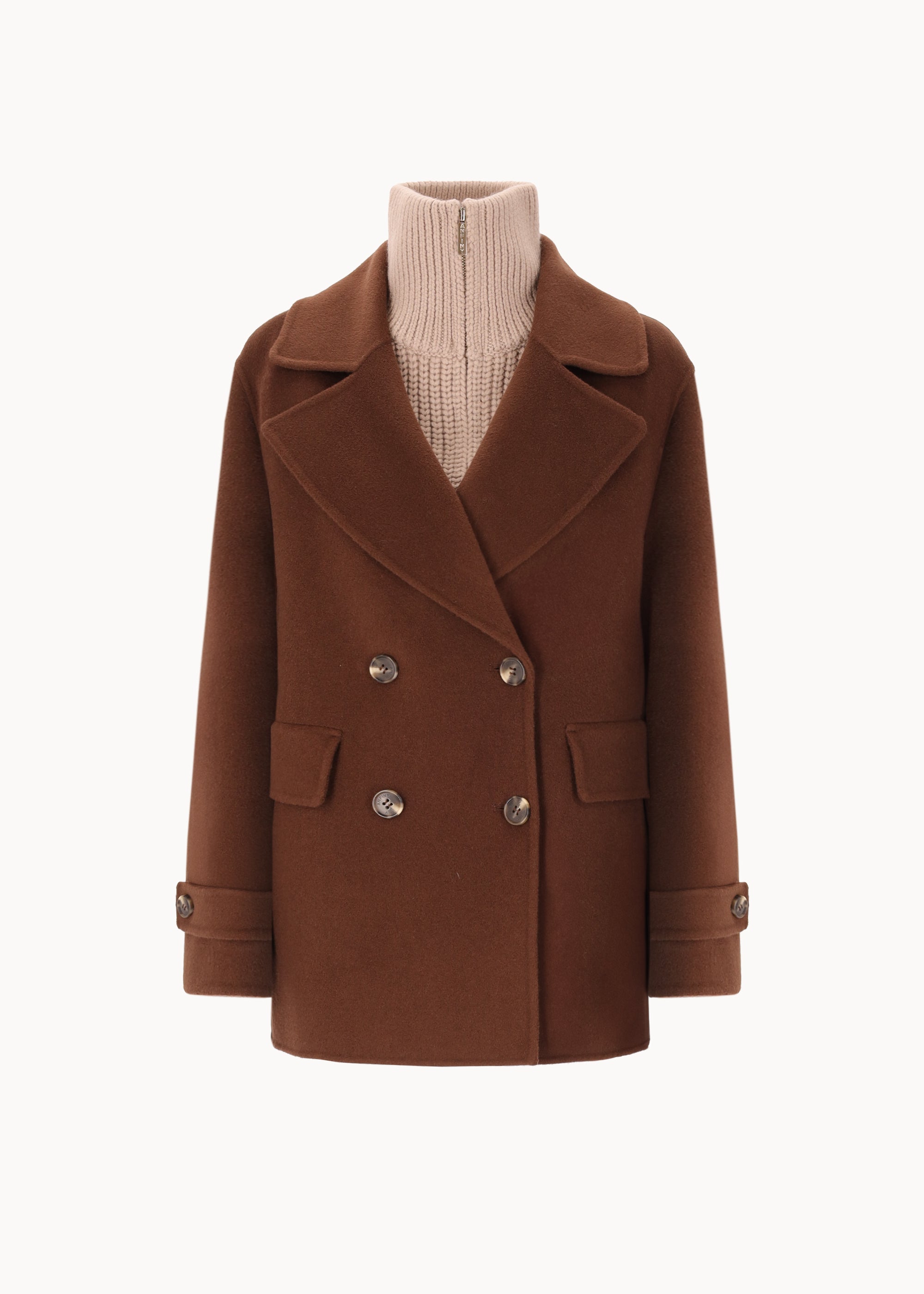 Un caban corto dal taglio semi-over, realizzato in panno double di pura lana. Il design doppiopetto, impreziosito da dettagli sartoriali e rifiniture artigianali, combina eleganza e praticità in un capo intramontabile.