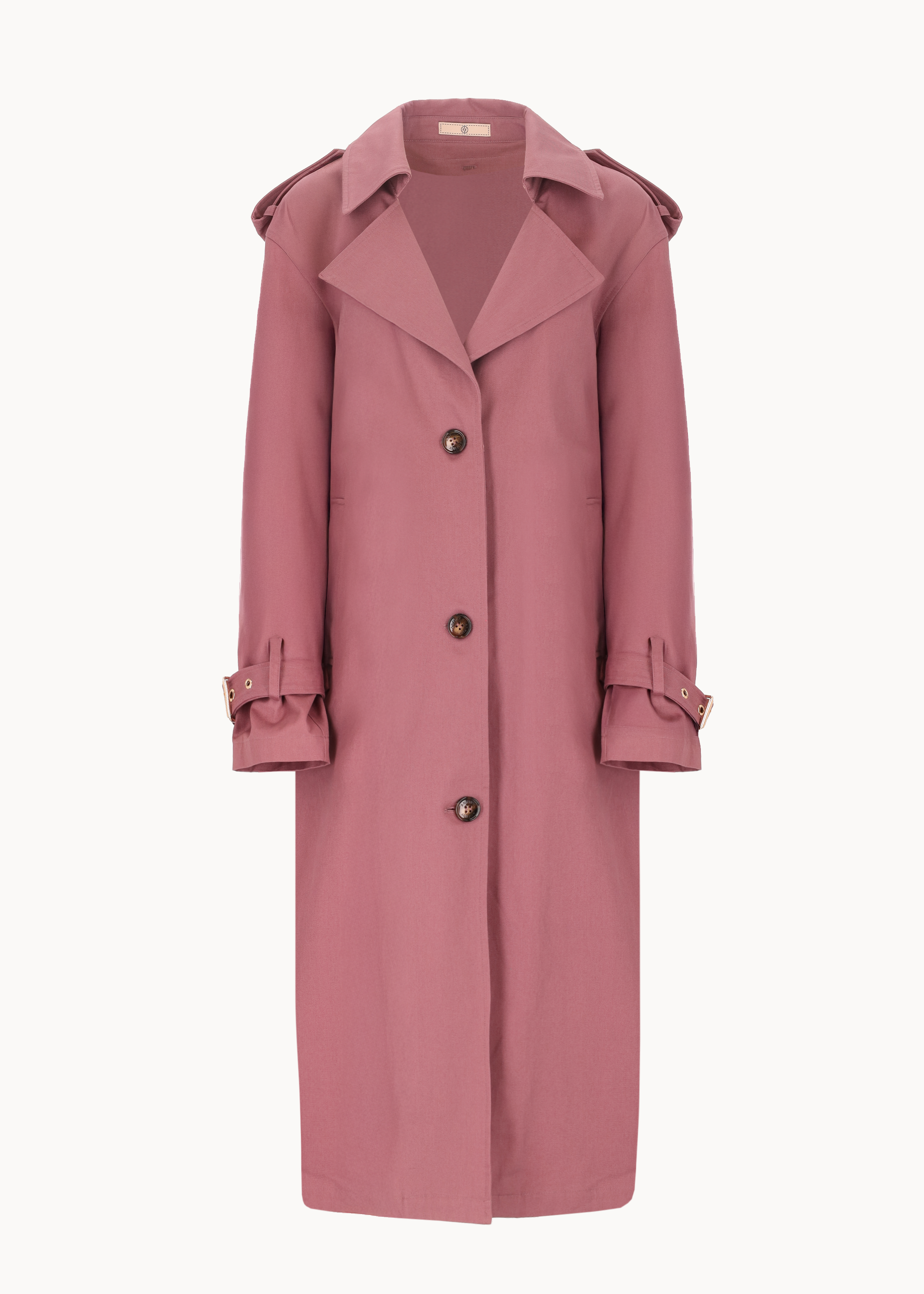 Spolverino monopetto in gabardine dalla linea morbida. Un essenziale versatile, facile da sovrapporre e curato nei dettagli.