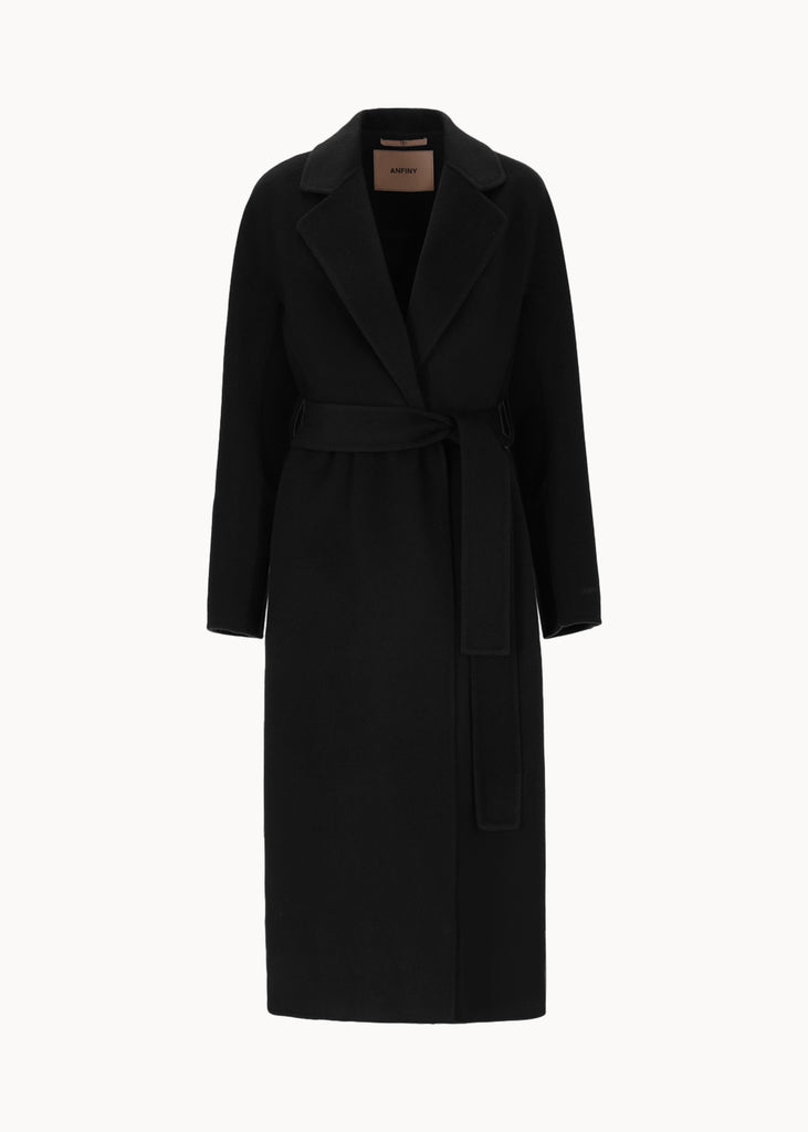Double-breasted wrap coat with a soft fit, featuring raglan sleeves at the back and a seamless front construction for a fluid, elegant silhouette. Unlined with refined double stitching and side inset pockets.
