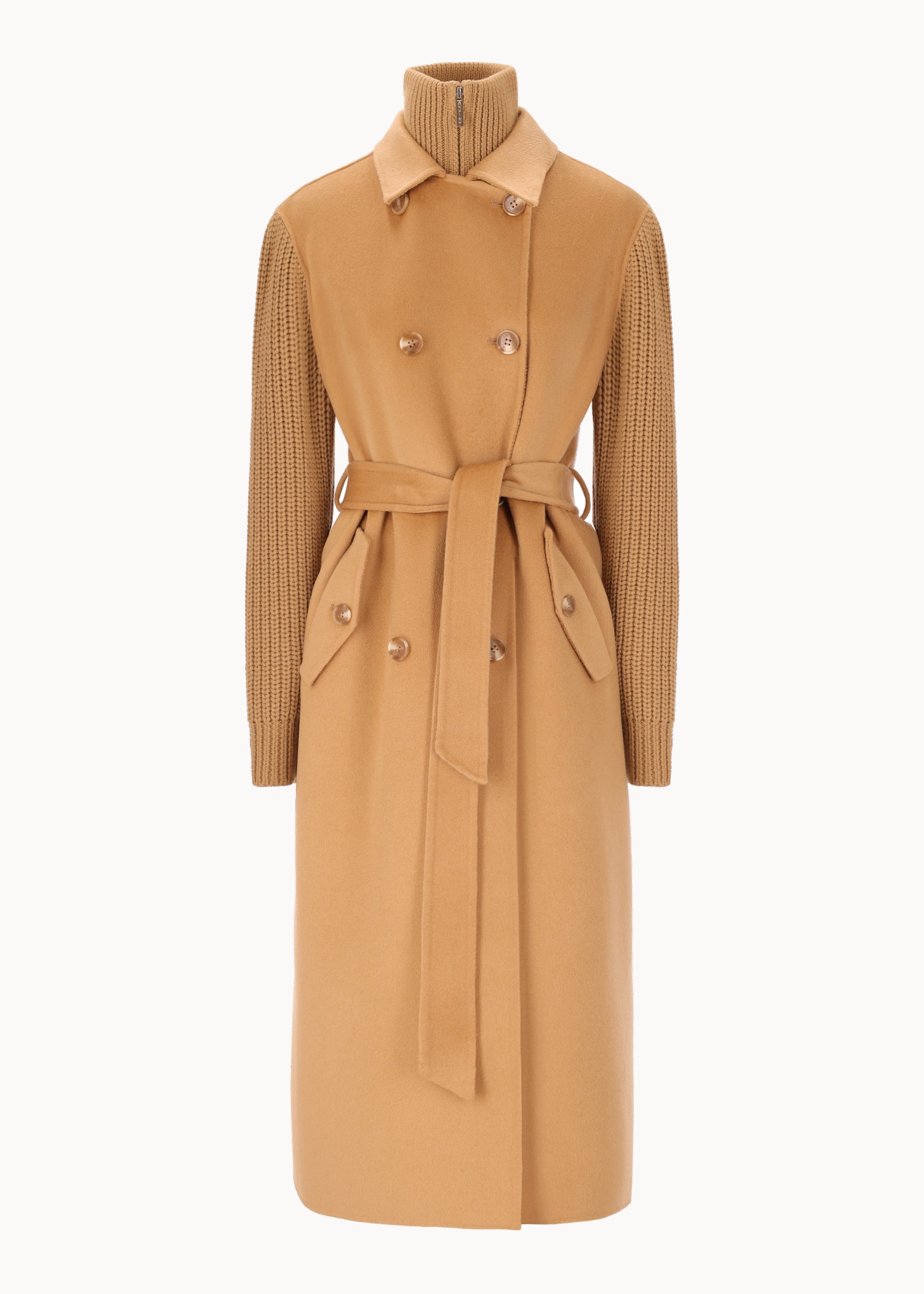 A timeless double-breasted trench with a semi-fitted silhouette, designed in fine double wool fabric. The detachable belt and handmade finishes enhance its versatility, while knit sleeves and tailored details add comfort and a refined touch.